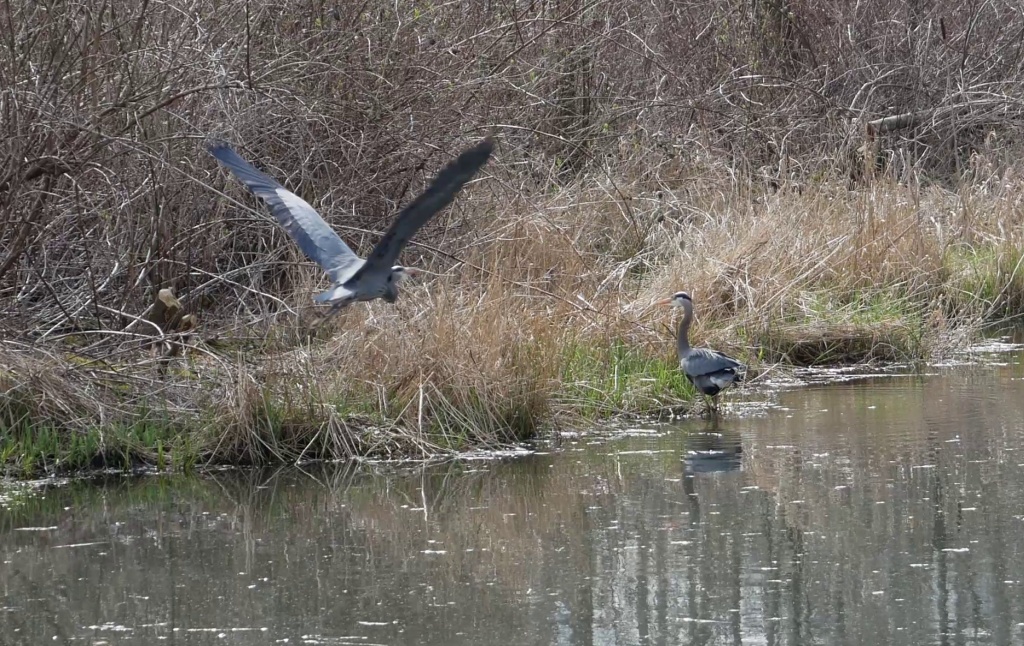 This week we visited the Great Blue Heron Nature Reserve in Chilliwack and got to see a nesting colony of herons. This particular colony has around 95 active nests! Although we were hoping to get a close up look of the nests, like we’ve seen at Stanley Park in downtown Vancouver, we found the trails leading to the nesting colony to be closed off from March to July. Understandably, the nature reserve’s first goal is to protect this vulnerable species from human activity which we’ve learned can cause the heron’s to abandon their colony. So, we were satisfied to peek through the holes in the various bird blinds around the nature reserve to watch the blue herons at a respectable distance. Our zoom camera got us those up-close views we were hoping for.