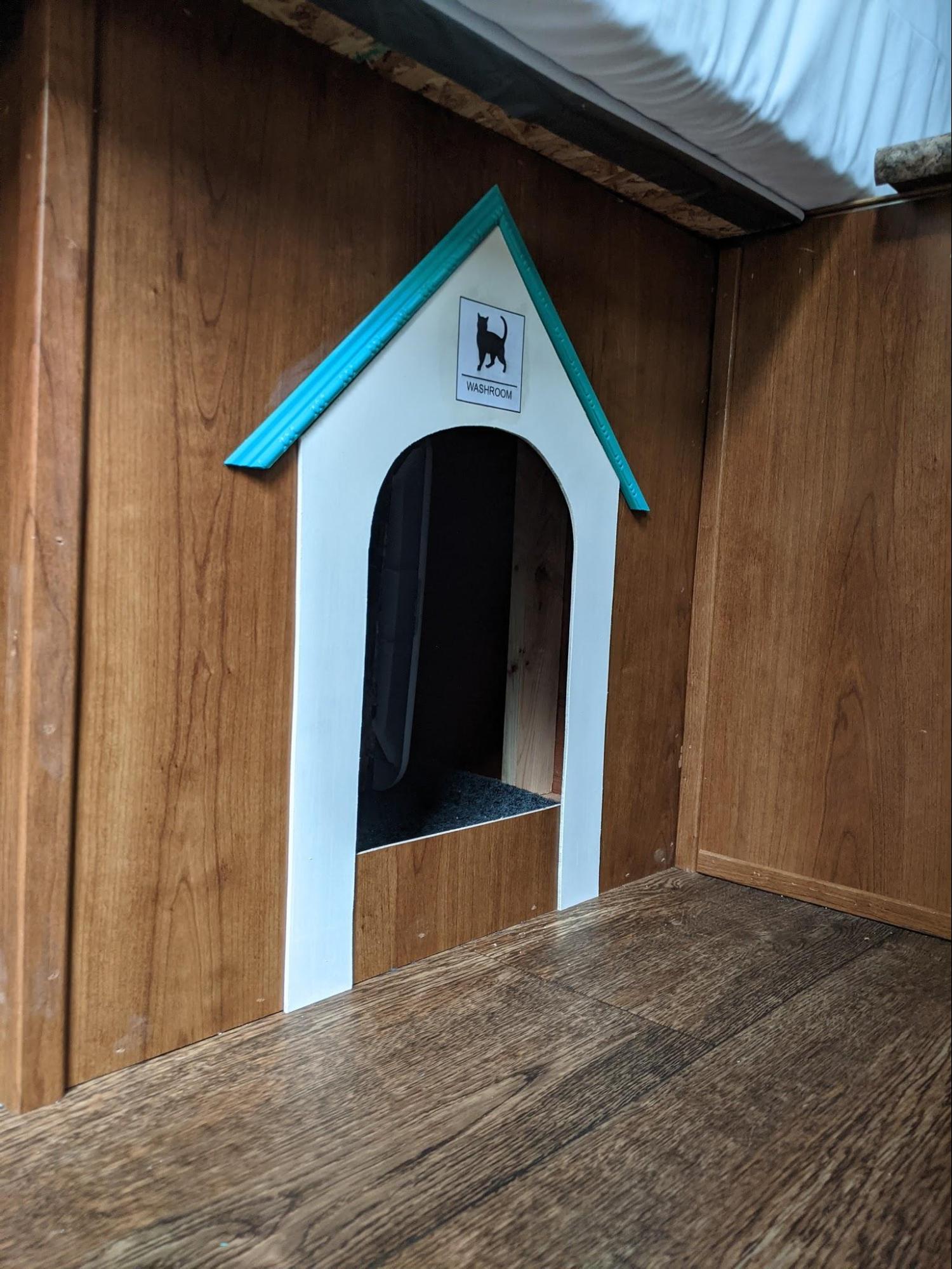 - Under the bed storage compartment - This is where we chose to put Benny’s litter. Iit is tall enough for him to stand/squat, and large enough to fit the box and allow for walking space in front to catch tracked litter. The entry, which we cut out ourselves, is also tall and wide enough that he doesn’t have to squeeze through which is great as he ages and becomes less able to do acrobatics or contortions to get in and out of small spaces.