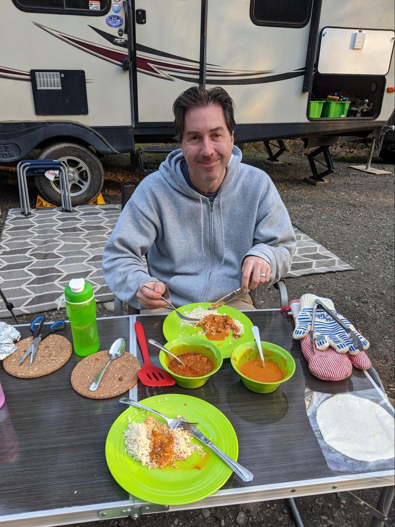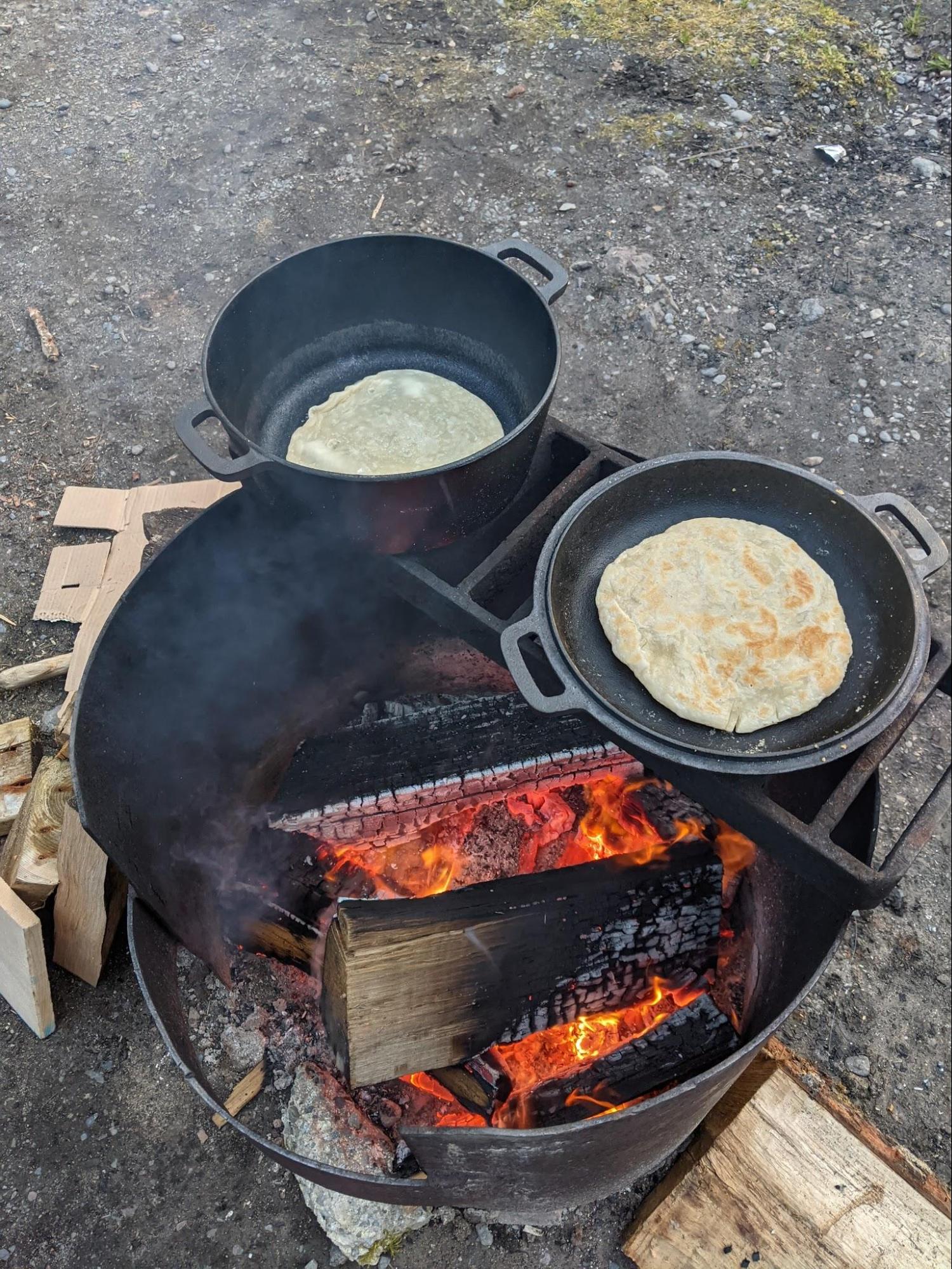 In fact, we cooked an entire Indian dinner on ours! We brought our favorite ready-made curries from the grocery store so all we had to do was boil the packs in water. The lid of our cast iron pot doubles as a skillet with which we were able to reheat the rice we brought and cook the flatbreads, called parathas.