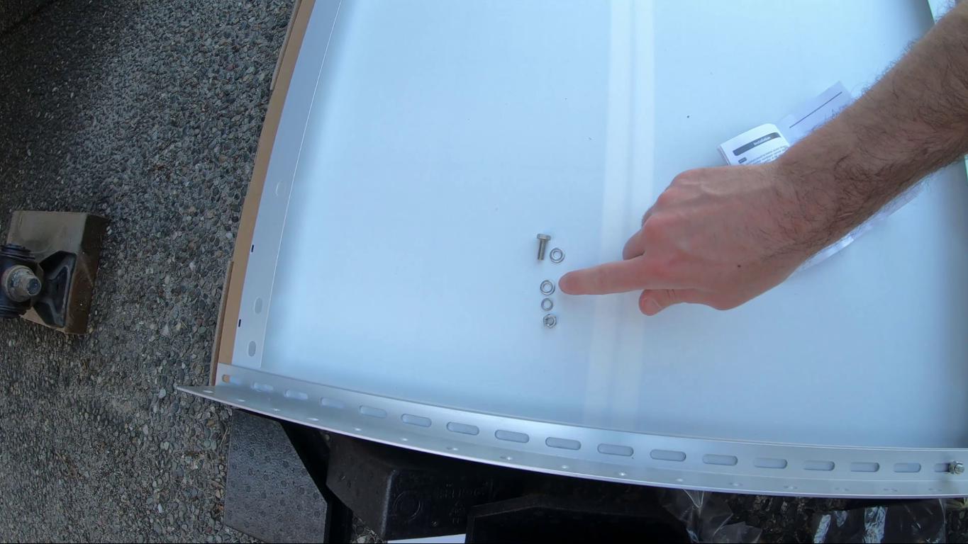 - Attach the tilt brackets. They come with instructions and these can tilt up to 90 degrees to maximize that very low winter sun. To attach the bracket to the panel you're going to want to feed all the bits onto the screw in this order: the nut, and then a washer, and then the bracket, another washer, lock washer, and then the bolt.