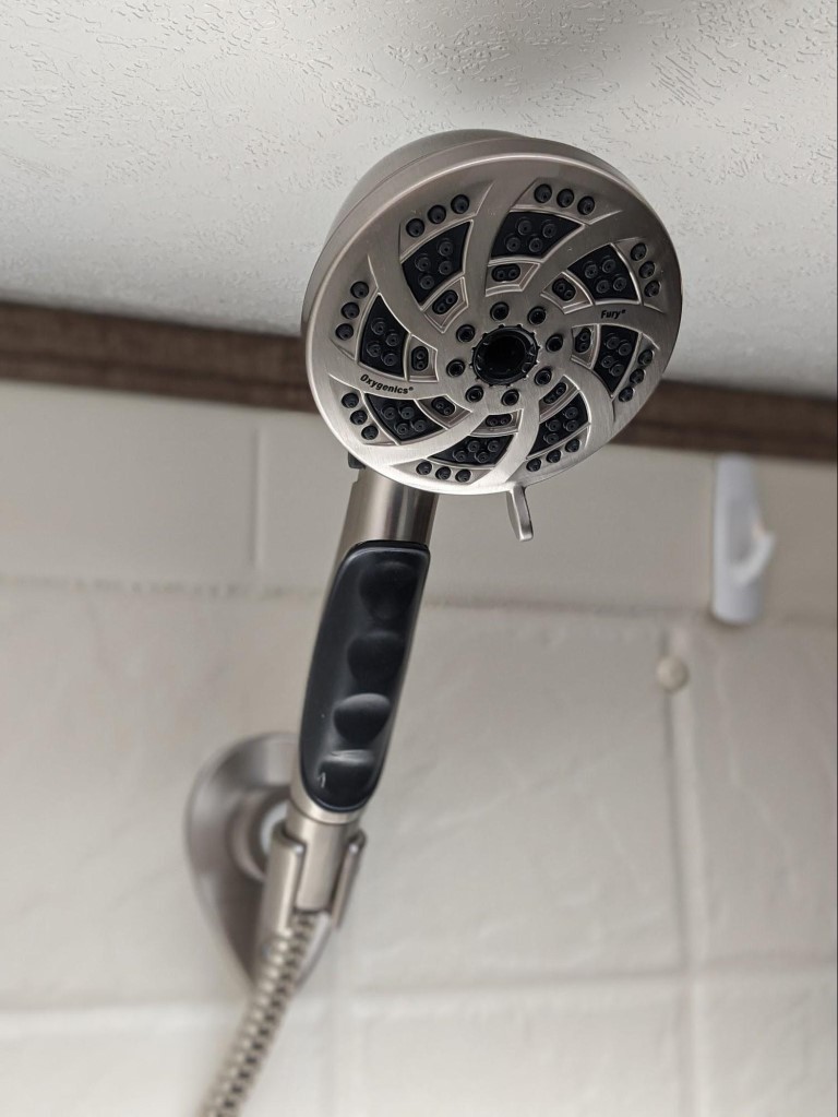 We bought and installed an Oxygenics Fury RV shower head because the standard shower head in our RV offered a very lacking shower experience and we found ourselves wasting a lot of water trying to rinse off in what can only be described as a trickle. Washing Mel’s long and thick hair was the biggest pain and hassle ever! It took forever for that shower head to rinse all the shampoo out. The old one had to go.