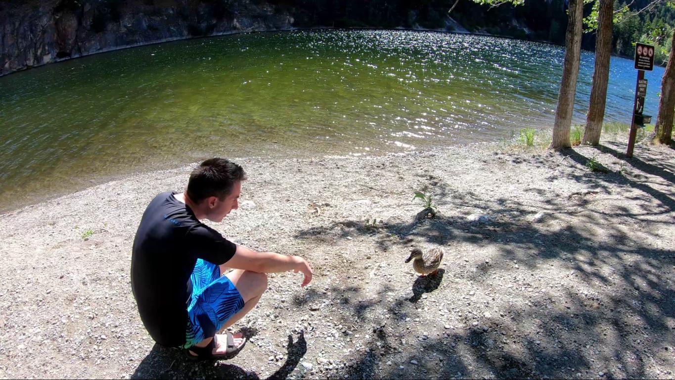 If you’ve been following our Cowboy Loop series already, you’re likely aware that Jay decided to swim in all of the lakes we visited. This part was planned, but what was not planned was having a feathered friend join him while we were staying at Marble Canyon Provincial Park. The docile duck just walked up to him and he played along inviting her to go for a swim. It was such a cute moment, making this week’s video one of our most memorable for us so far.