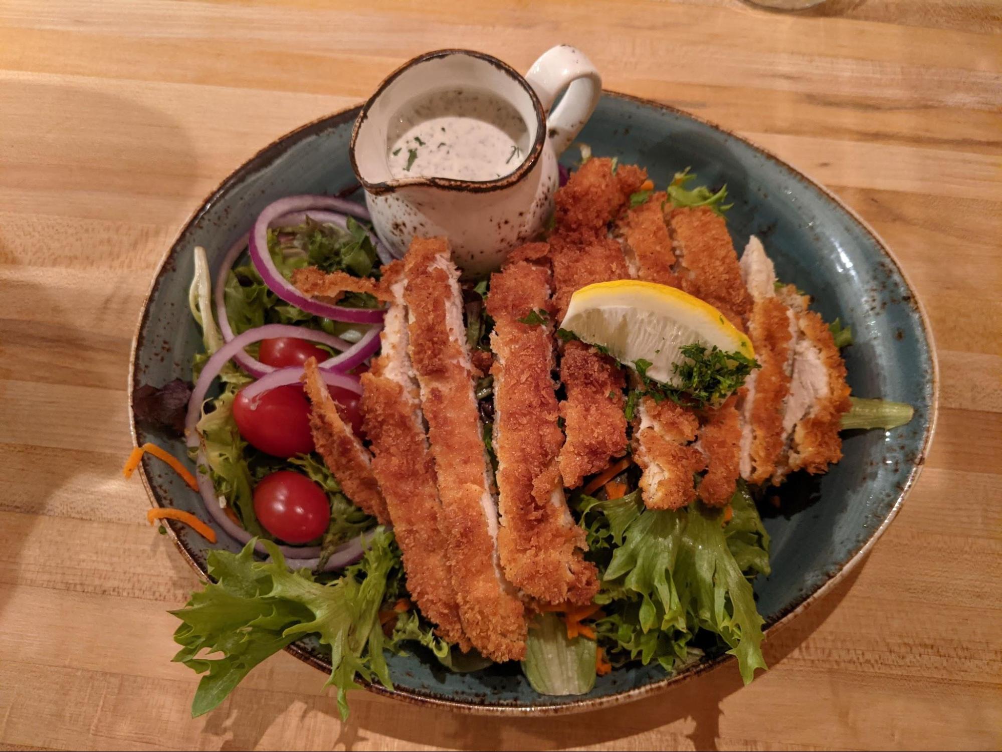 After our visit with Santa’s most important partners in transportation, it was time to head back into town for dinner. We were recommended a German restaurant at the visitor’s center that has a German chef on staff. They made a really nice schnitzel served with potato salad (what Jay had) and a chicken schnitzel salad (what I had). Paired with dinner, we also tried a mulled wine. It was delicious!