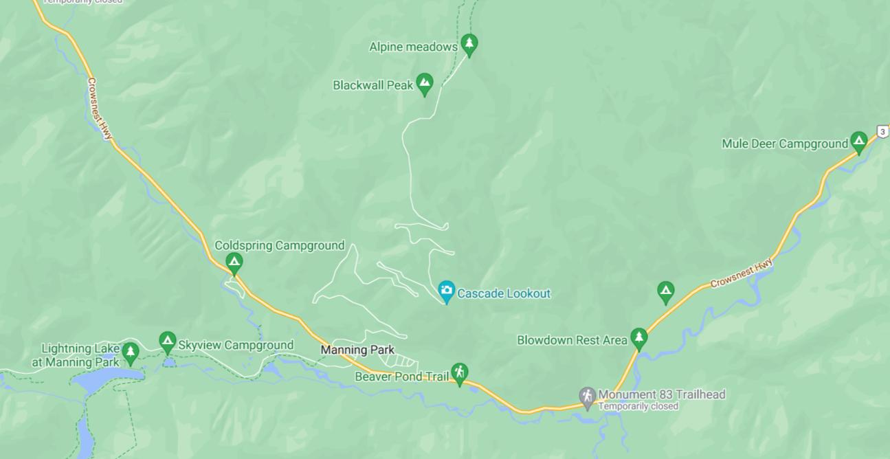 Manning Park has over 300 km of trails to discover, and there is something available for every ability, ranging from gentle lakeside walks to multi-day backcountry treks to the highest peaks in the Cascades. There was a trail accessible directly from the Coldspring Campground - the canyon loop trail that followed the Similkameen River (down one side and up the other) to Gibsons Pass Rd where other trails linked up nearby.