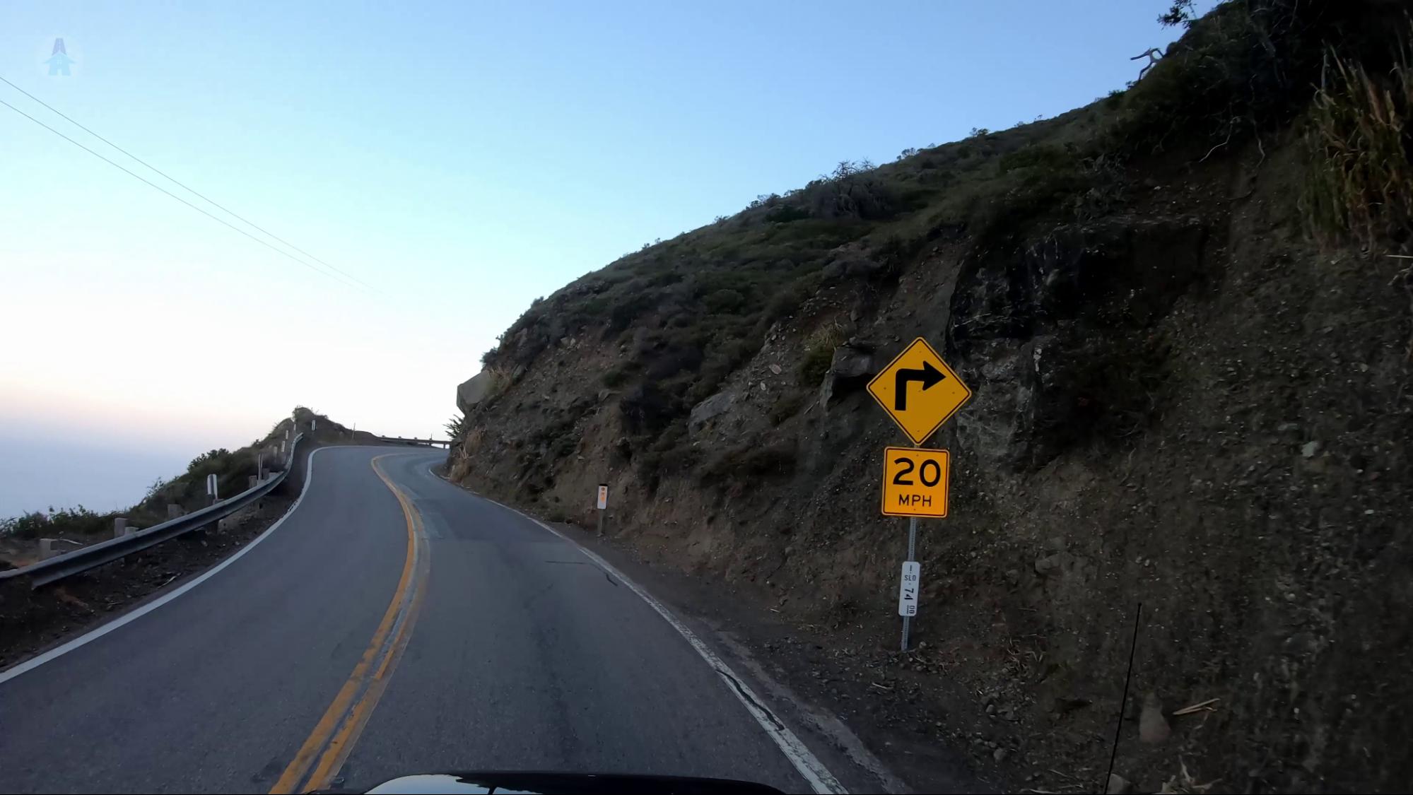 Taking on some of these mountain roads will give cause for slowing down, and that's okay—just keep to the right so that faster-moving vehicles can pass. If you're driving well below the limit, you should also turn on your four-ways, just like you'll see the semi-trucks doing. Something you'll notice while driving in the mountains are windy roads and recommended speed limits for those turns. These are very accurate recommendations for large vehicles and trucks towing trailers, so we recommend you follow them closely.